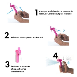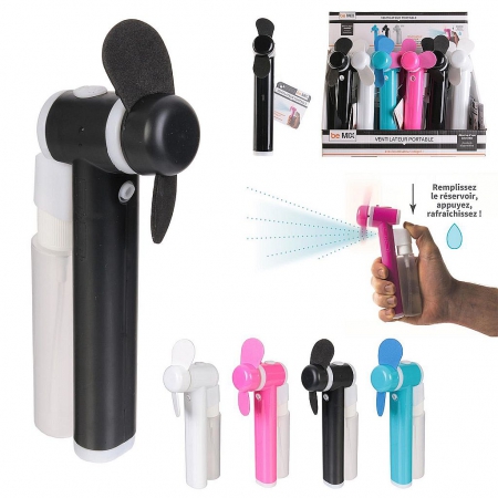 VENTILATEUR BRUMISATEUR PORTABLE Dimension : 16*8*7 cm Différentes couleurs assorties Fonctionne avec 2 piles LR06 non incluses.