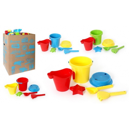 SEAU DE PLAGE 17 CM UNI Kit de jeux de plage composé d'un seau, 1 arrosoir, 1 moule, 1pelle, 1 rateau et 1 tamis. 4 COULEURS DE SEAU ASSORTIES