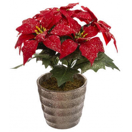 POT POINSETTIA PAILLETTE Description assortiments: ROUGE FLOQUE ET PAILLETTES Dimension produit: L. 17 x P. 17 x H. 22 cm Matière: POLYESTER/PVC_/METAL