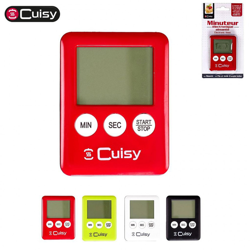 Minuteur éléctronique aimanté Mode d'emploi fourni pour le minuteur Couleur : blanc / rouge / noir / vert Dimension : 7 x 5.5 x 1 cm Piles incluses