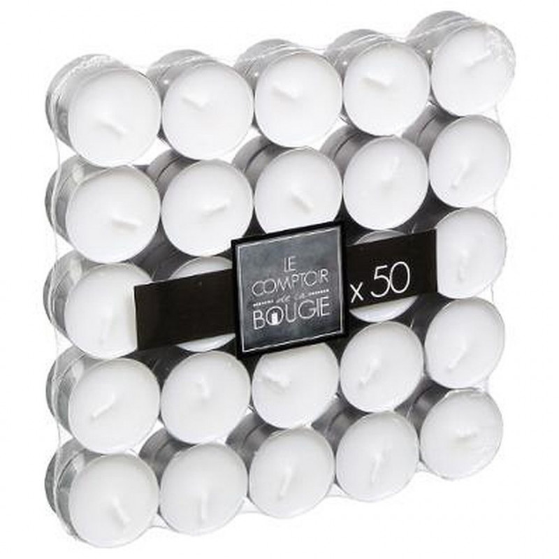 BOUGIES CHAUFFE PLATS PAR 50 Couleur: Blanc Dimension produit: D. 3,7 x H. 1,8 cm étail dimensions: Lot de 50 filmé : L. 18,7 x l. 18,7 cm x H. 2.8 cm Matière: CIRE Packaging: FILM