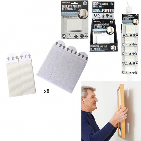 8 LANGUETTES ADHES FIXATION Fixez sans trou et enlevez sans trace vos cadres grâce à ces fixations murales ! Pratique, scotchez les languettes et collez-les à vos murs pour fixer vos tableaux.