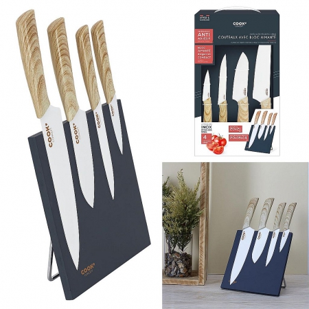 Ce lot de 4 couteaux en acier inoxydable sera du plus bel effet dans votre cuisine grâce à son design ! Ce bloc de 4 couteaux de cuisine sera du plus bel effet dans votre cuisine ! Ils vous permettront de découper, hacher ou émincer vos fruits, légumes et viandes. Vous apprécierez sa légèreté et son tranchant incomparable pendant la préparation de vos recettes ! Appréciez son support aimanté qui ne vous laissera pas indifférent. - Lame 7.5cm x1 - Lame 12cm x2 - Lame 20cm x1 - Dimensions bloc ouvert : 20x18x14cm