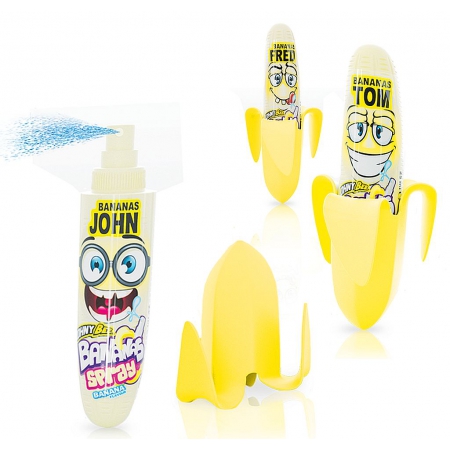 BANANA SPRAY JOHNY BEE Jouets en forme de banane contenant du bonbon liquide en spray saveur banane.