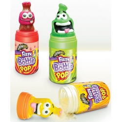 FIZZY BOTTLE POP Mini Bouteilles Fizzy Bottle Pop - Sucette à tremper dans de la poudre acidulée et pétillante en forme de bouteille - Parfums : Citron, Orange, Cola Dimension : 4*4*11 cm