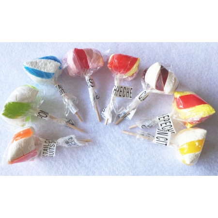 Sucette artisanale emballée individuellement, papier film type CPP40Y, baton sucette en bois de hêtre.