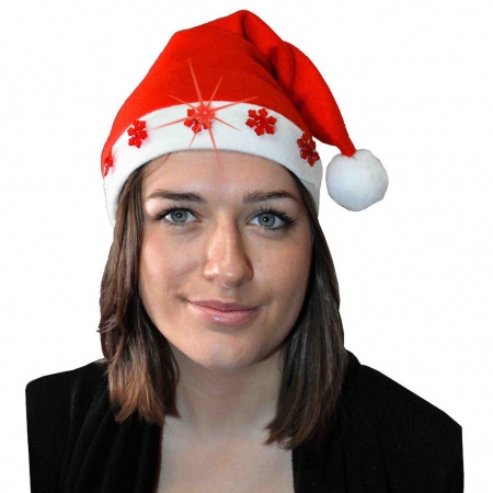 BONNET ADULTE LUMINEUX Bonnet feutrine douce, 5 flocons lumineux rouge, lumière rouge LED. Taille adulte. Piles boutons fournies