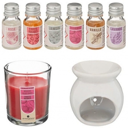 Description assortiments: Bougie parfumée Fruits rouges. 6 flacons d'huile parfumée : Vanille, Rose,