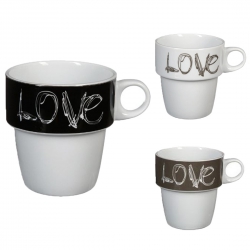 MUGS RACK LOVE Description assortiments: DANS LE SET : 2 NOIR / 2 GRIS / 2 BLANC RACK Dimension produit: L. 13cm ; l. 13cm ; h. 30cm Matière: PORCELAINE/FER Packaging: BOITE IMPRIMEE