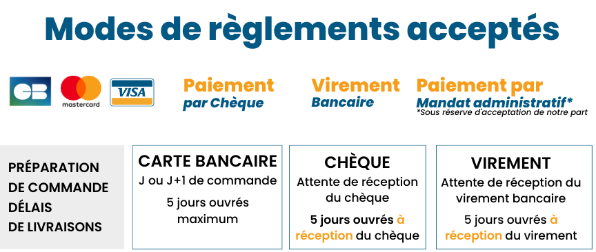 La réception trop tardive des chèques ou des virements bancaires peut engendrer des problèmes au niveau des stocks. Privilégiez si vous le pouvez, le mode carte bancaire. Dès la validation de vos commandes sur le site, celles-ci sont générées automatiquement et éditées dans nos locaux.