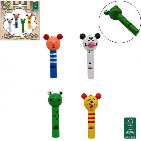 Sifflet en bois animal, 4 modèles assortis. Un jeu sonore et amusant pour les enfants, idéal pour les écoles, associations et kermesses. Développe l’ouïe et l’imagination !