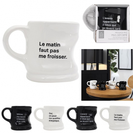 Vous êtes de mauvaise humeur tous les matins au réveil ? Une journée sans café n'est pas envisageable ni pour vous ni pour vos proches ? Vous avez besoin de ce mug ! Le message humoristique vous mettra de bonne humeur de bonne heure ! Buvez du thé, du café ou du chocolat chaud dans ce mug pour une journée cosy à la maison. Idéal pour offrir à ses proches, ce mug déformé est ultra original pour boire ses boissons chaudes ou froides préférées.