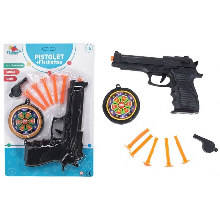 PANOPLIE PISTOLET 21 CM LANCE FLECHETTES AVEC SIFFLET ET CIBLE