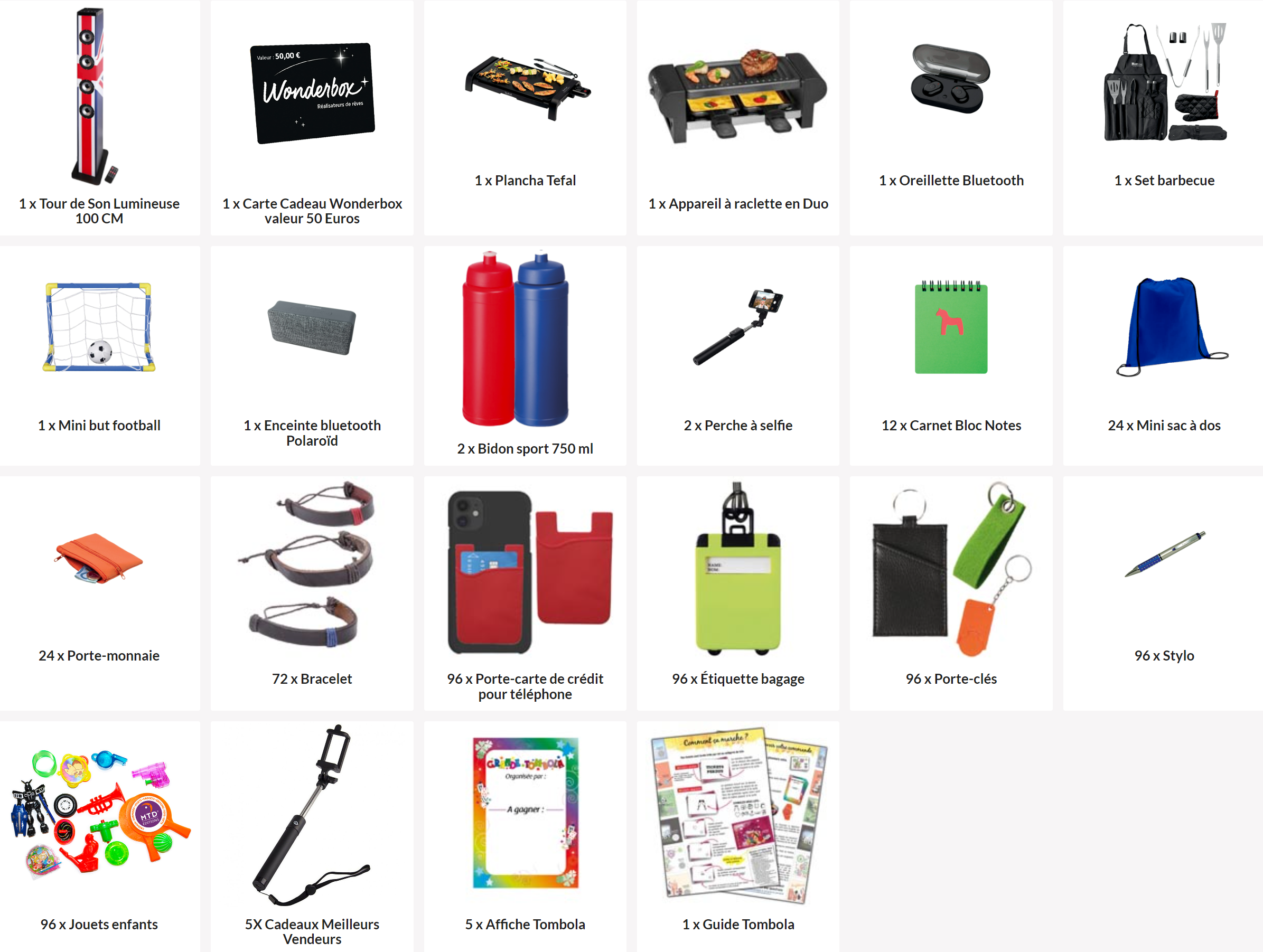 0 MINUTE DE PERDU : Tout est prêt. Nous vous fournissons les tickets personnalisés avec votre texte plus tous les lots. Vous trouverez également dans votre colis (expédié sous 3 jours par un transporteur spécialisé) : des cadeaux meilleurs vendeurs, des affiches et un livret conseil. Ainsi vos bénévoles gagnent du temps pour se consacrer à la bonne gestion de votre club.
