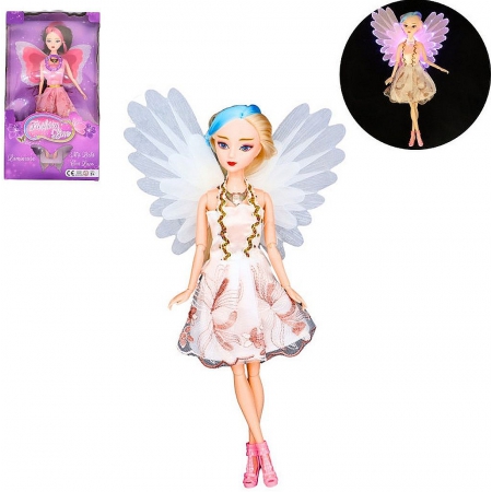 POUPEE FEE 29CM AILES LUMINEUSES Dimension de la boite : 34*18*6 cm Poupée : 29 cm Fonctionne avec piles boutons incluses